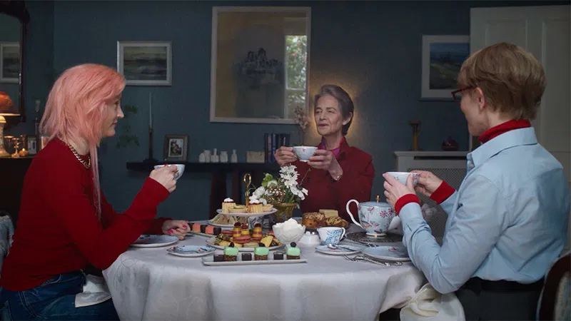 Next, the story shifts to Dublin, with Charlotte Rampling’s imperious novelist mother hosting her grown daughters: Cate Blanchett’s uptight Timothea and Vicky Krieps’s flaky Lilith. The scene is filled with tea, fabricated successes, and sibling rivalry that goes nowhere fast. Lilith’s “Uber” arrives with her girlfriend in a clumsy attempt at humor, and the sisters giggle over unread books, but genuine connection remains elusive. The exchanges are polite, loaded with passive-aggressive jabs, yet they never evolve beyond superficiality, leaving the impression that these characters barely know each other.